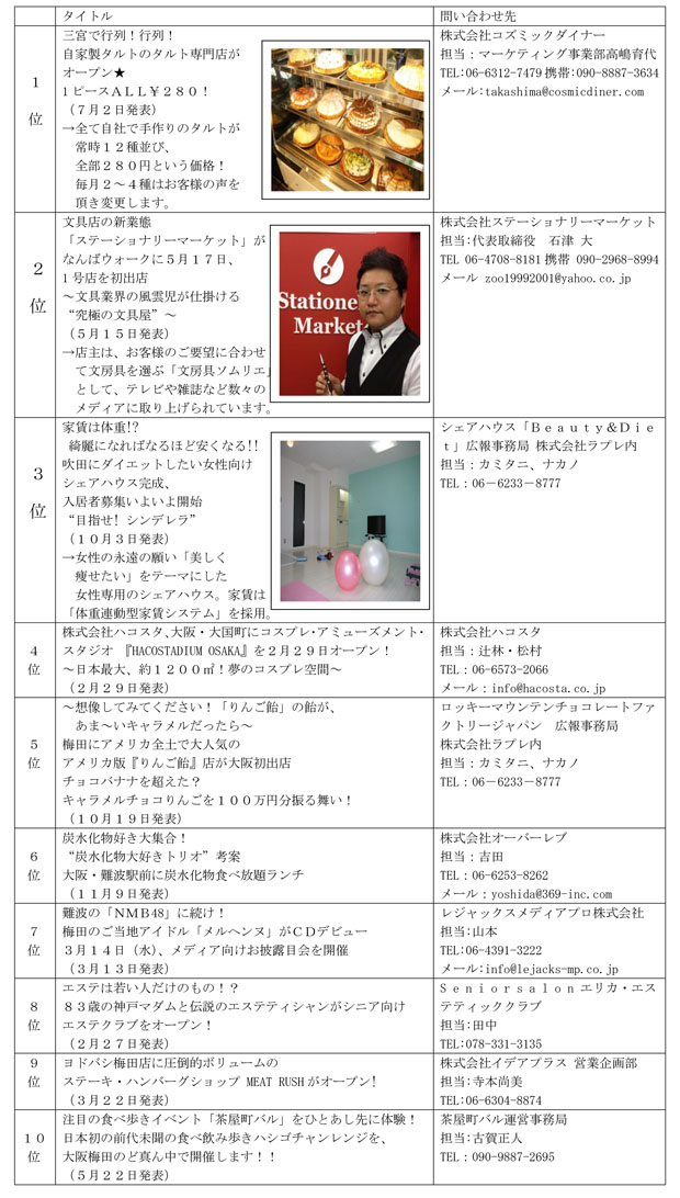 プレスリリース配信サービス「PRでっせ」へのアクセス数を中心に、2012年に「関西で話題になった人・モノ」をランキング致しました。