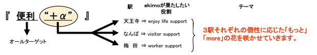 「ekimo(エキモ)」は、大阪を代表する御堂筋線の3駅(天王寺・なんば・梅田)に、関西初、駅ナカ初、新業態を含むショップを誘致し、施設展開を行ってまいります。また“街のサポートステーション”として、「駅ナカから、咲かそう。」をキャッチフレーズに、大阪の駅ナカから元気を発信していきます。