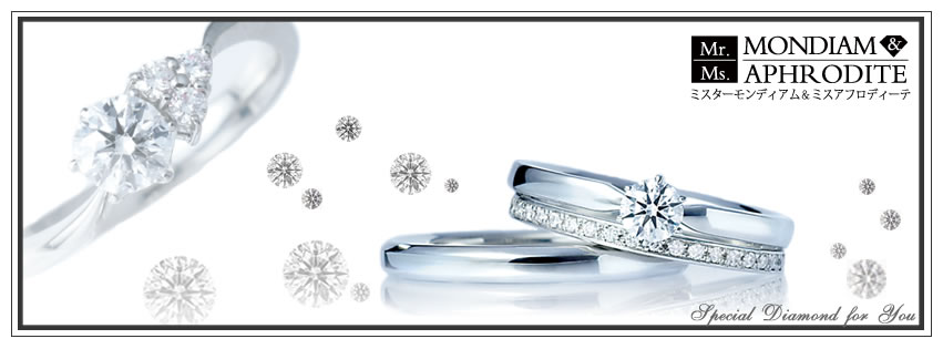 アフロディーテの豊富な商品デザイン性と厳選された高品質ダイヤモンドはそのままに、モンディアムαで多くのお客様よりご支持をいただいている24時間ネットショッピングが楽しめるシステムとリーズナブルな価格こそ、新ブランド『ミスターモンディアム&ミスアフロディーテ』です。