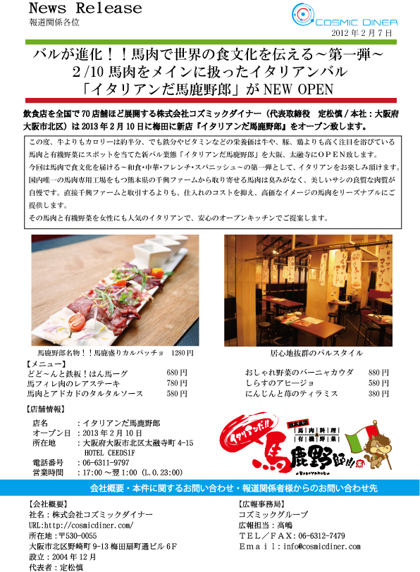 飲食店を全国で70店舗ほど展開する株式会社コズミックダイナー(代表取締役 定松慎/本社:大阪府大阪市北区)は2013年2月10日に梅田に新店『イタリアンだ馬鹿野郎』をオープン致します。