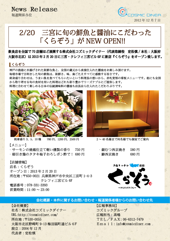 飲食店を全国で70店舗ほど展開する株式会社コズミックダイナー(代表取締役 定松慎/本社:大阪府大阪市北区)は2013年2月20日に三宮・クレフィ三宮ビル6Fに新店『くらぞう』をオープン致します。