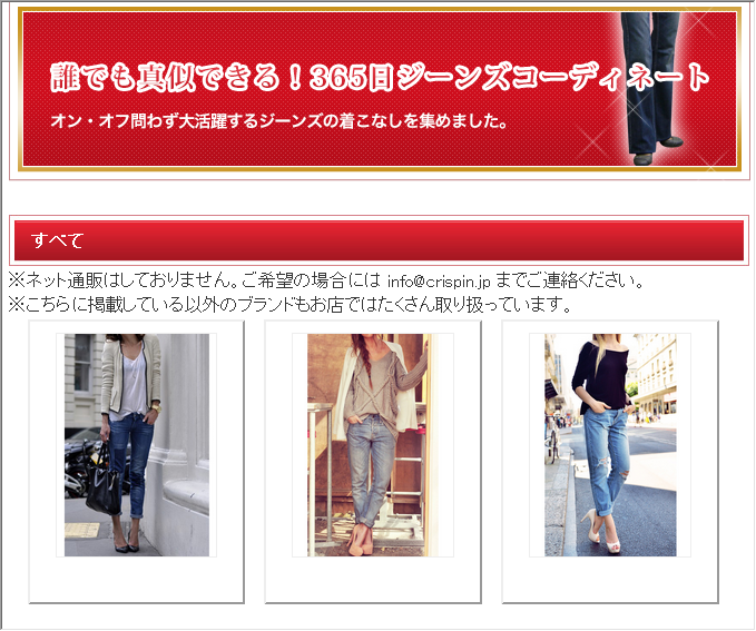 ジーンズ・スタイリングサロン クリスピンでは、WEBでも一番検索率の高い、<ジーンズの着こなし>を中心としたページを開設し、来店予約までの動機づけの強化や、来店後に着こなしに悩むお客さまのアフターフォローを行います。