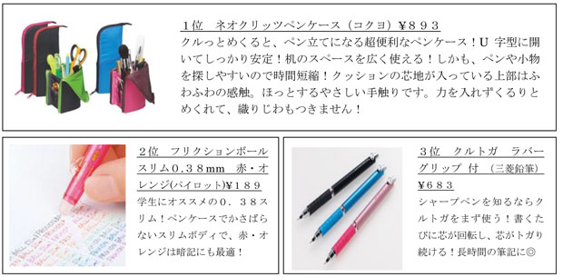 成績UPにつながる勉強お助け文房具が人気!2位にランクインしたフリクションは、累計6億本を突破するという驚異的な売り上げを記録。この1年で2億本以上売れるという文具歴史史上稀にみる商品となりました。