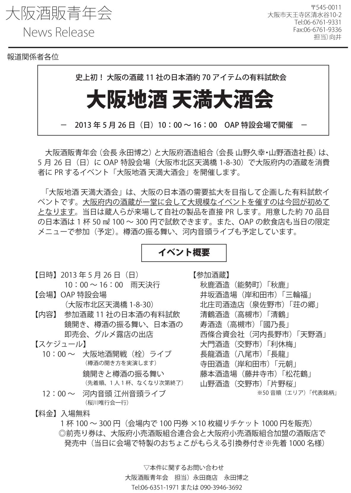 大阪酒販青年会(会長 永田博之)と大阪府酒造組合(会長 山野久幸・山野酒造社長)は、5 月 26 日(日)に OAP 特設会場(大阪市北区天満橋 1-8-30)で大阪府内の酒蔵を消費者に PR するイベント「大阪地酒 天満大酒会」を開催します。