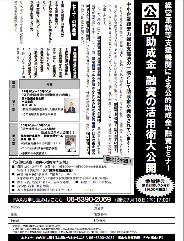 経営革新等支援機関による公的助成金・融資セミナー!公的助成金・融資の活用術大公開!
