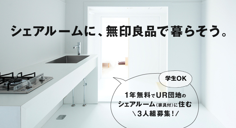 ムジ・ネット株式会社(本社:東京都豊島区 代表取締役社長:松井忠三)と、独立行政法人都市再生機構西日本支社(支社:大阪府大阪市 理事・支社長:大西誠)(以下、「UR都市機構」)は、WEBからご応募いただいた3人1組のお客様を選考させていただき、「MUJI×UR団地リノベーションプロジェクト」にて提供した「シェアルーム」で、暮らし体験モニターをお願いするキャンペーンを実施いたします。