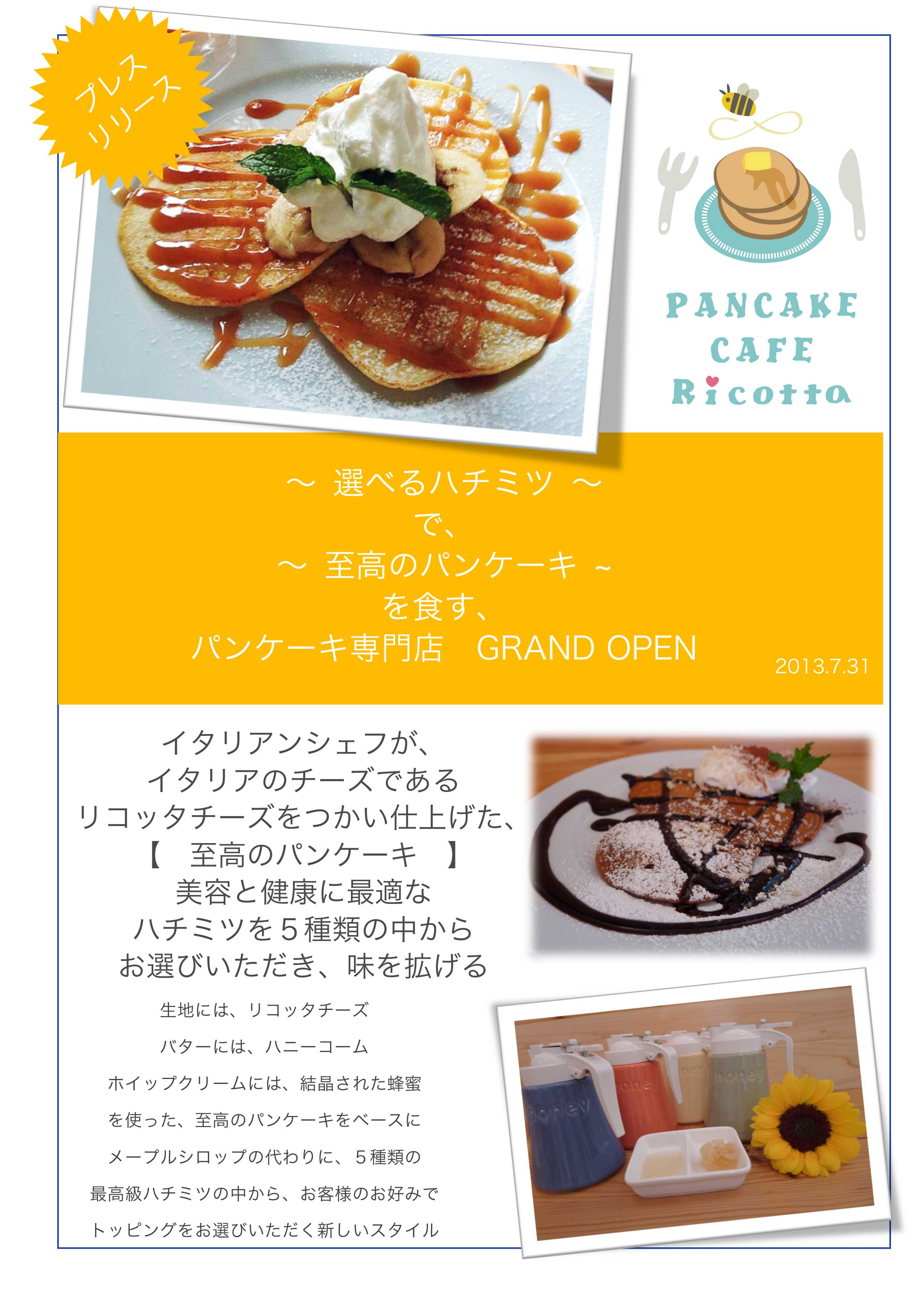 小売業を手掛ける、株式会社アーバンリンク(所在地:兵庫県神戸市、代表取締役:栗山直行)は、パンケーキ専門店 『Pancake café Ricotta』を、兵庫県加古川市に2013 年7 月31 日(水)よりOPEN しました。
