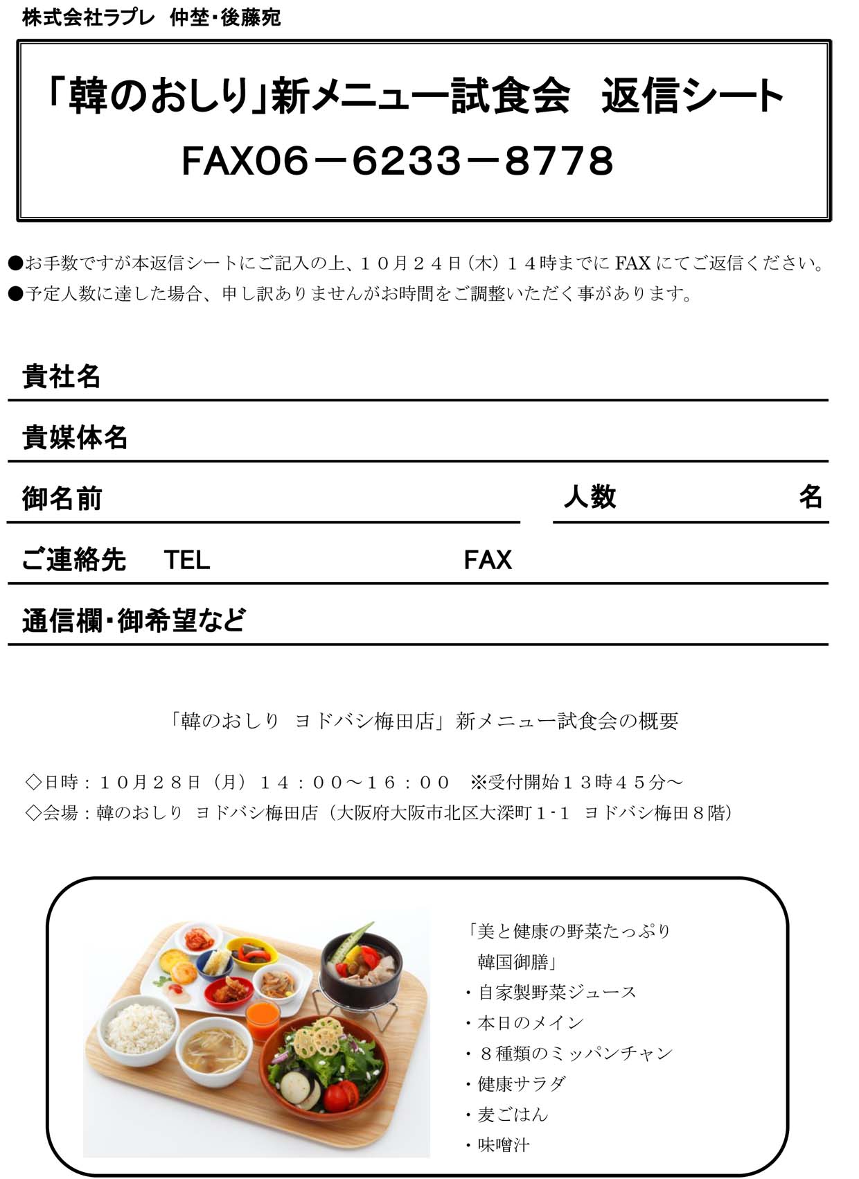 ランチメニューの一新に先立ちまして、10月28日(月)午後2時より、「韓のおしり ヨドバシ梅田店(ヨドバシカメラ8階)」にて、新メニュー「韓国御膳」の試食会を行い、韓国料理の五味五色、伝統的で健康的な食生活を体感していただきます。ぜひ、ご取材をお願い致します。