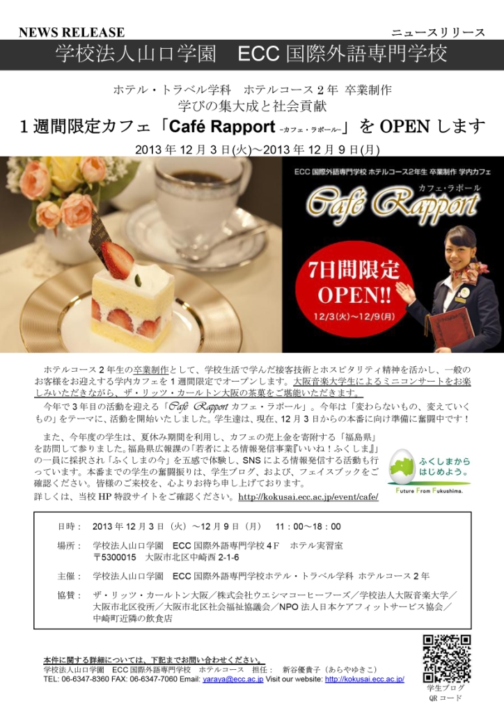 また、今年度の学生は、夏休み期間を利用し、カフェの売上金を寄附する「福島県」を訪問して参りました。福島県広報課の「若者による情報発信事業『いいね!ふくしま』」の一員に採択され「ふくしまの今」を五感で体験し、SNSによる情報発信する活動も行っています。本番までの学生の奮闘振りは、学生ブログ、および、フェイスブックをご確認ください。皆様のご来校を、心よりお待ち申し上げております。