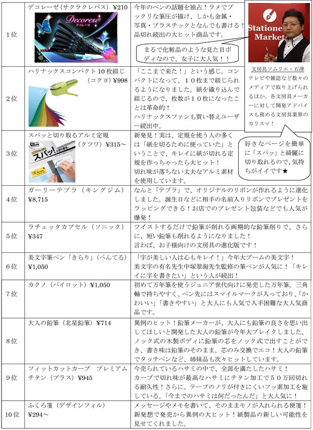 大阪・なんばの地下街「なんばウォーク」にある文房具店「ステーショナリーマーケット なんばウォーク店」(大阪市中央区千日前1丁目なんばウォーク 5-5号)の店主で、「文房具ソムリエ」としてテレビや雑誌などで活躍する石津 大(いしづ ひろし)はこの度、2013年の人気文房具ベスト10を発表致しました。