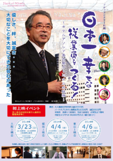 ハートオブミラクルでは、人の心にスポットを当てた映画などを配給しており、「日本一幸せな従業員をつくる~ホテルアソシア名古屋ターミナルの挑戦~」は、不況の中、誰一人リストラせず、“従業員を幸せにする”ことに徹して、そして見事に赤字から黒字に転換した会社のドキュメンタリー映画です。