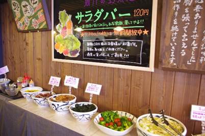「ラーメン店」=“野菜不足”と思われがちですが、最近のお客様は健康志向の方も多いので、ラーメン店で野菜不足を解消して頂きたいと考え、野菜・スイーツ食べ放題のサラダバーを始めました。