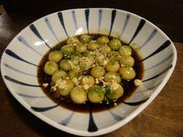 ラーメンのスープに使用する醤油を使用したタレに、かつお節に見立てた「きな粉」と青のりに見立てた「抹茶」をふりかけ、見た目はたこ焼きのようなみたらし団子です。