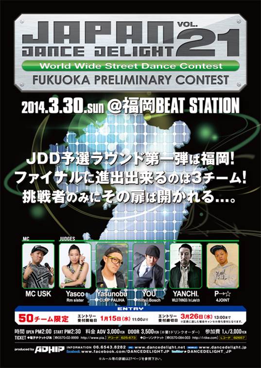 日本最大のストリートダンスコンテスト「JAPAN DANCE DELIGHT(ジャパンダンスディライト)」を運営する株式会社アドヒップ(大阪府大阪市西区北堀江1丁目19−1八光心斎橋AIRビル6F)は、2014年3月30日(日)14時より、BEAT STATION(福岡市中央区渡辺通4-11-4)にて、同コンテストの福岡地区予選大会を開催致します。