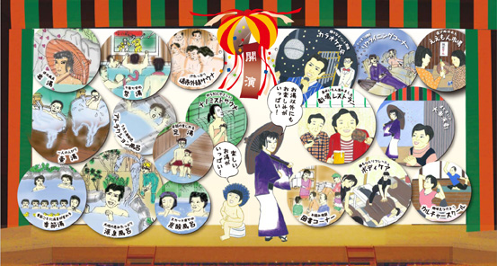 【源泉湯・炭酸風呂・季節湯・祭湯・アトラクション湯・岩湯・足湯・壺湯・遠赤外線サウナ・体潤うナノミストサウナ】