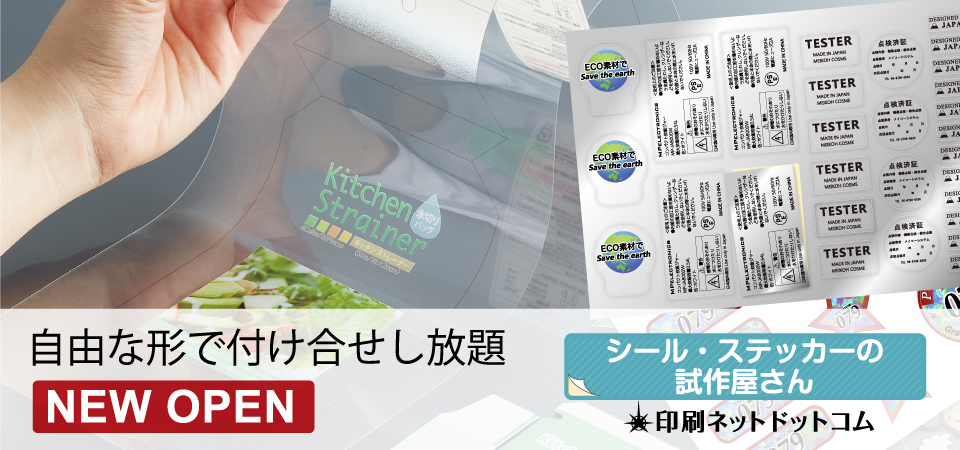 印刷ネットドットコム【 シール・ステッカーの試作屋さん OPEN 】自由な形にハーフカットで付け合せし放題、透明、白PET、ホログラム、開封消し銀などレアな素材も。送料無料キャンペーン中(4/30まで)