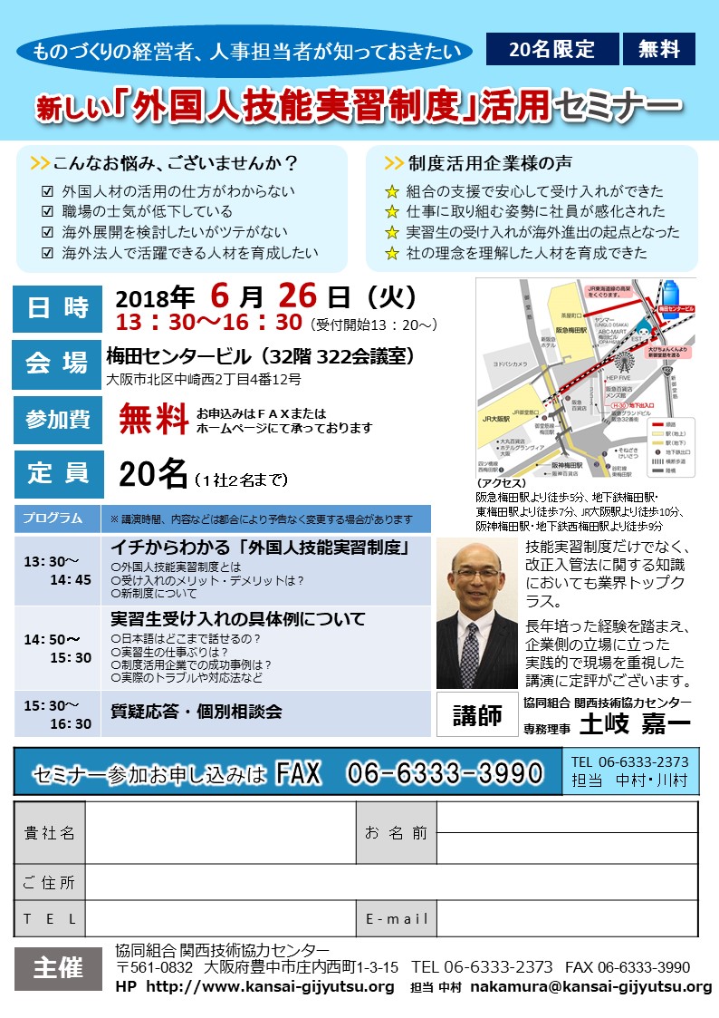 2018年6月26日(火)新しくなる「外国人技能実習制度」の活用セミナー』を開催します
