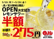 【森ノ宮大阪城公園店OPEN決定記念】 卓上レモンサワー飲み放題が半額の60分275円|5月13日(月)〜5月31日(金)の平日、焼肉ホルモンまるよし精肉店全店で開催